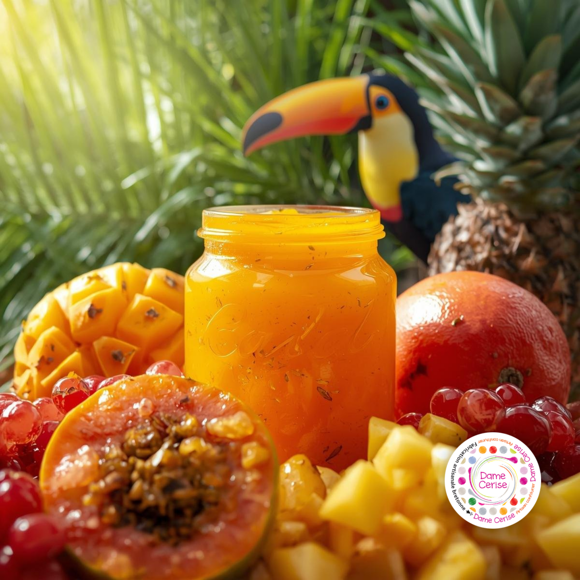 Confiture Mangue, fruit de la passion, papaye, ananas.